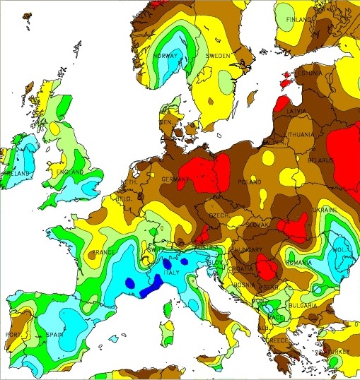 Écart aux normales des températures et précipitations pour l'Europe occidentale.