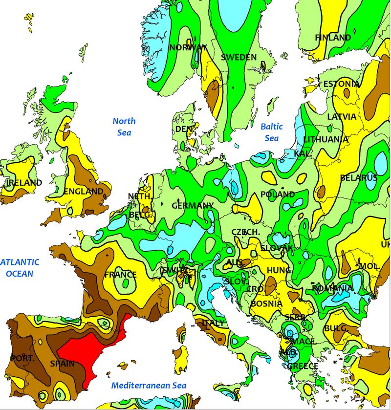 Écart aux normales des températures et précipitations pour l'Europe occidentale.
