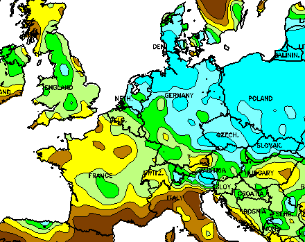 Ecart aux normales des températures et précipitations pour l'Europe occidentale.