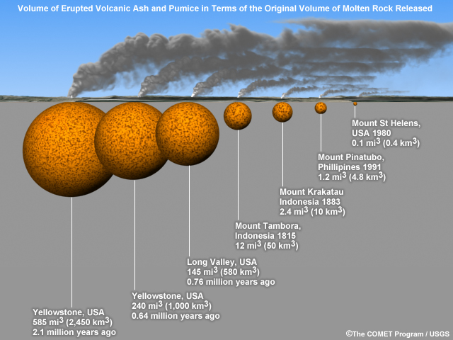 1. la quantité des cendres rejetées qui peut, comme lors de l'éruption du Tambora donner une couche qui filtre les rayons solaire et diminue la température des couches basses de l'atmosphère. Mais attention ! cette chaleur est accumulée dans les couches hautes, il y aura donc un effet compensatoire tôt ou tard.