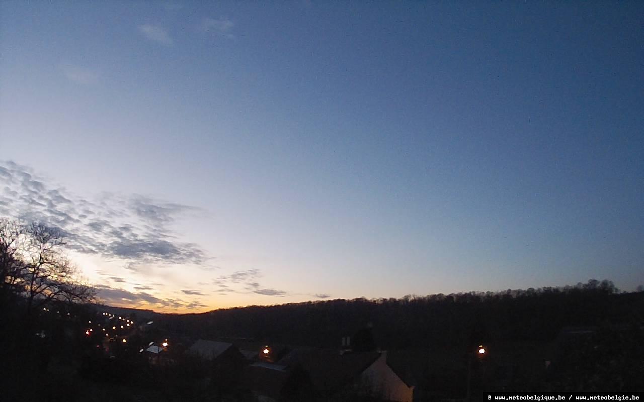 Sur l’est et le sud-est du pays, les brouillards et stratus ont parfois du mal à se dissiper. Du côté de Liège, le temps devient beau l’après-midi avec des cirrus et quelques stratocumulus d’étalement issus des averses occidentales. Dans les Cantons de l’Est, on note des stratus puis cumulus fractus avant un ciel très dégagé l’après-midi. En Ardenne par contre, la grisaille tend à persister. Dans cette partie du pays, même à basse altitude (vallées), la température ne dépasse généralement pas le zéro degré.