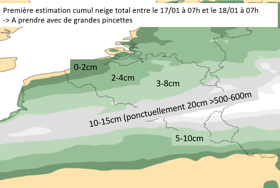 En Belgique à la mi-journée, cette limite passe un peu au sud de Charleroi et de Namur, et se prolonge vers l’est-nord-est pour passer un peu au sud de Verviers. Cette limite se trouvait un peu plus au sud en matinée, et redescendra à nouveau vers le sud en après-midi. Plus tard, durant la nuit, les précipitations neigeuses finiront par gagner l’ensemble du pays.