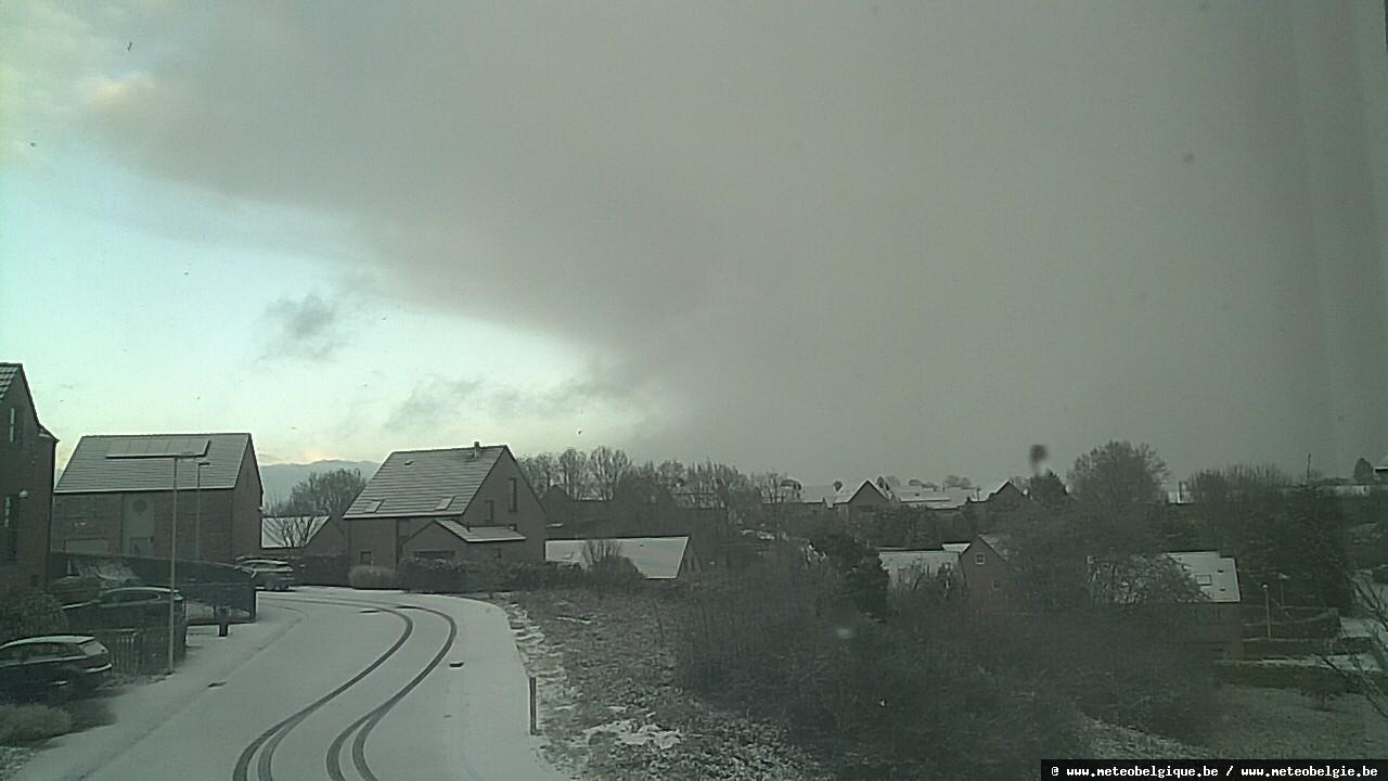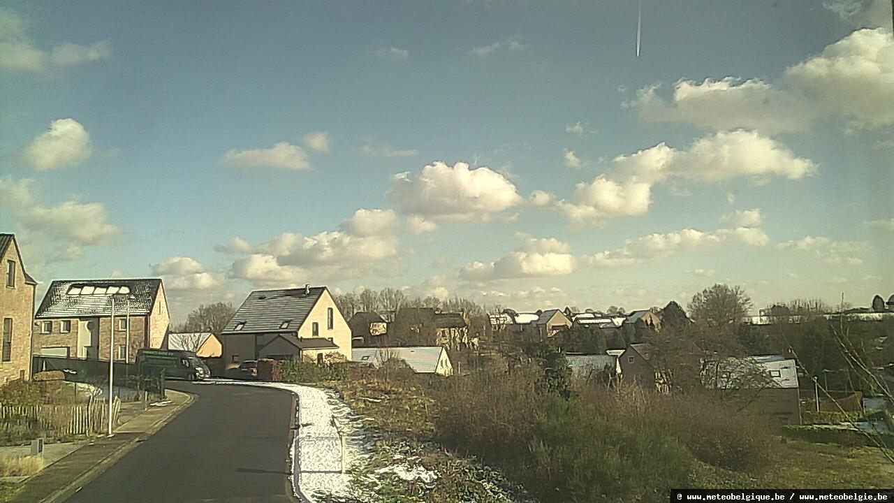 Sur l’ouest du pays, nous avons un véritable ciel de traîne avec cumulus et cumulonimbus. Plus vers l’est, les éclaircies se font plus larges, avec quelques altocumulus et stratocumulus, puis les cumulonimbus arrivent quand même avec, là, des averses de neige. À Braine-l’Alleud par exemple, une fine couche de neige est présente le matin, qui fond ensuite en grande partie avant de se reconstituer sous les averses de l’après-midi.