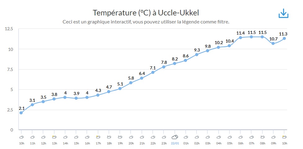 Sur le graphique d’Uccle, on peut voir l’extrême rapidité de la remontée des températures entre 10h (21/01) et 10h (22/01).