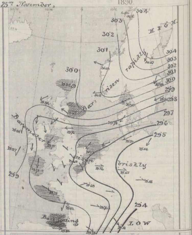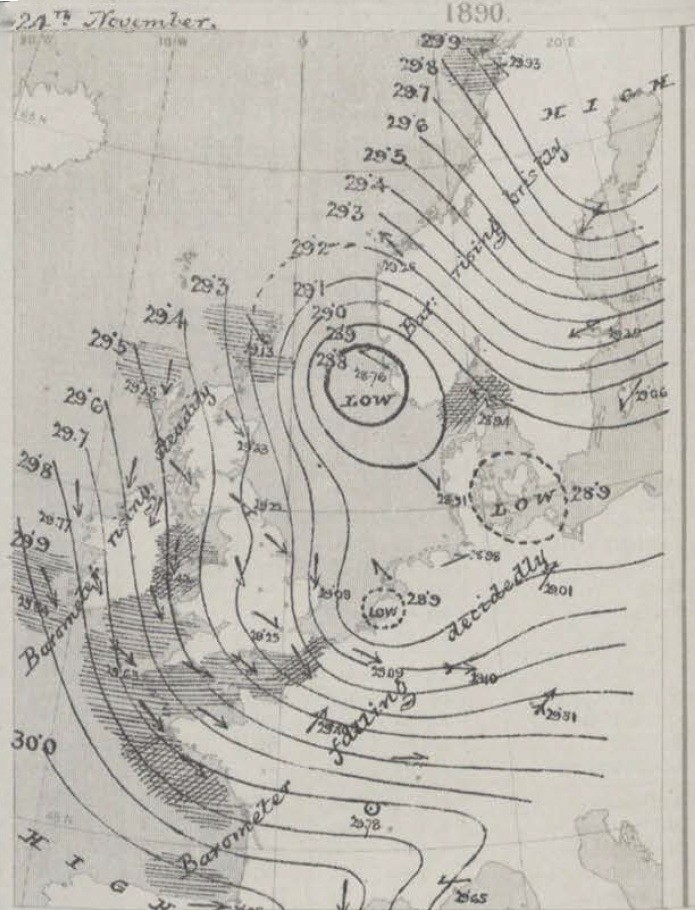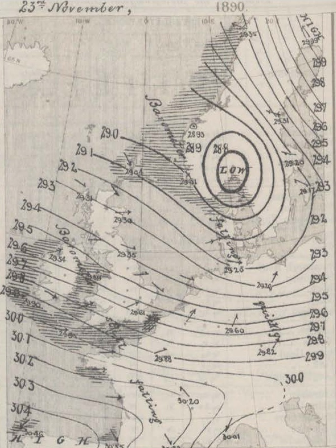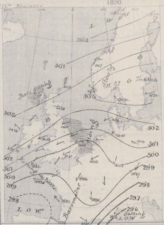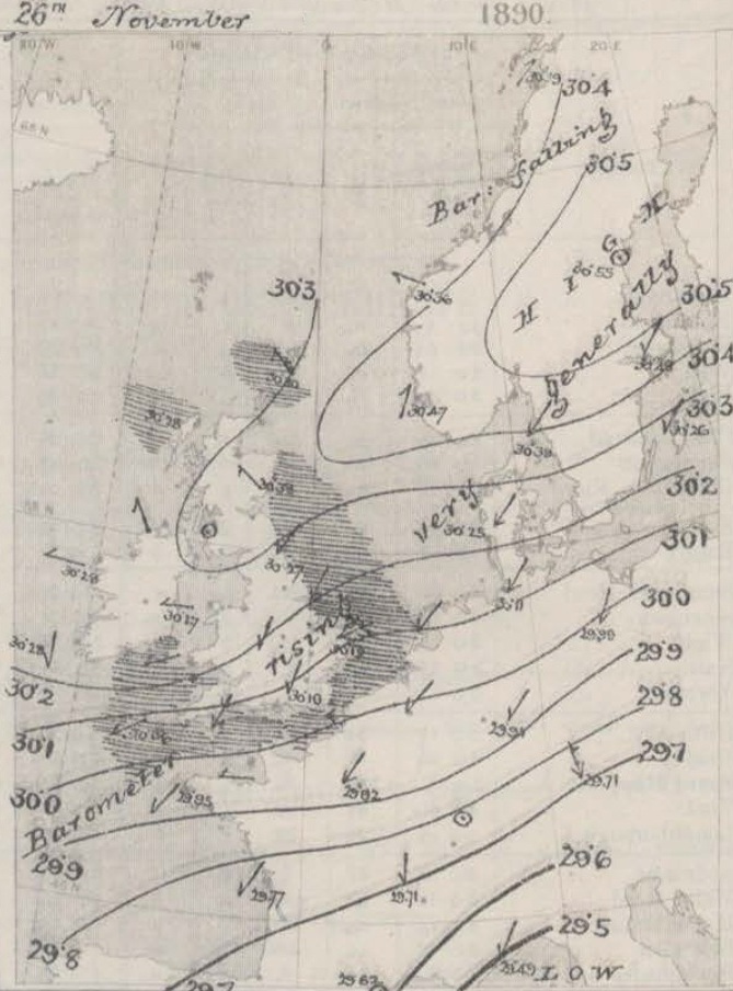 Le 26 novembre 1890. La situation semi-dépressionnaire et semi-maritime de la veille a encore tempéré le froid, mais la descente des basses pressions vers la Méditerranée a ouvert la porte à des courants glacials commandés par un anticyclone sur la Scandinavie.