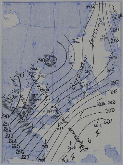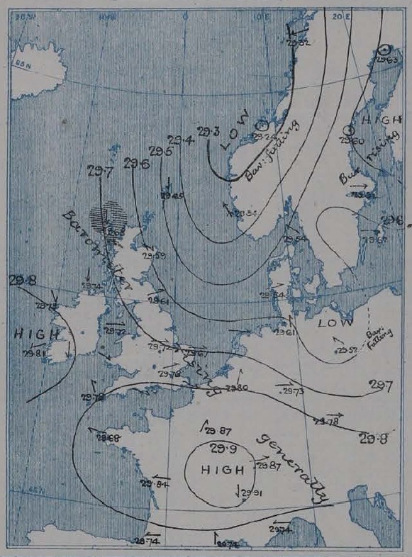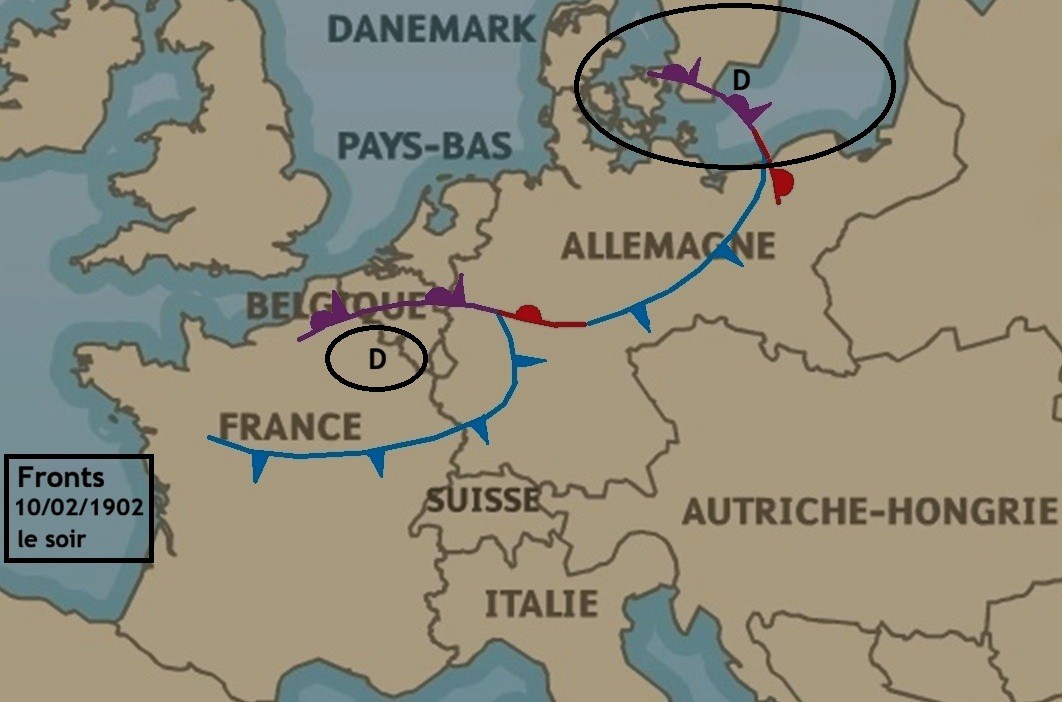 Cette petite zone de basse pression fait partie d’un complexe dépressionnaire beaucoup plus vaste, à plusieurs noyaux, dont le principal noyau, quasi stationnaire, se trouve juste au large des côtes de Norvège. Un autre noyau, plus mobile, se déplace du Danemark vers la Mer Baltique. La frontologie de Bjerknes n’est pas encore inventée en 1902, ce qui signifie qu’il n’existe pas encore de cartes météorologiques avec fronts tracés. Cependant, en étudiant les températures et les précipitations (pluvieuses et neigeuses) enregistrées le 10 février 1902, il devient possible de deviner plus ou moins où peuvent se situer les fronts, et la situation atmosphérique pourrait bien ressembler à la carte ci-après, même s’il est vrai qu’ici, on est dans le domaine de l’hypothèse.