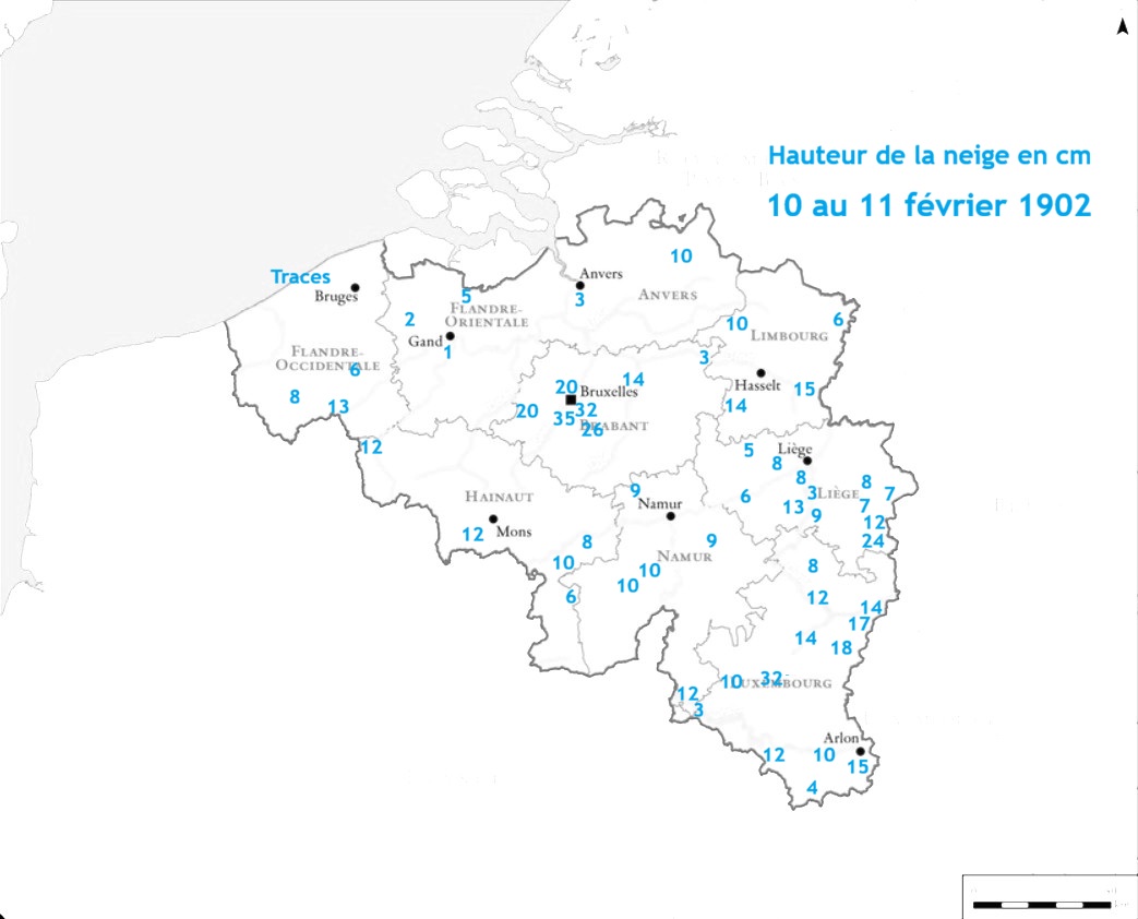 Pour ce qui est de l’épaisseur de neige en général, ce record tient toujours aussi, mais est talonné par les 34 centimètres des 29 et 30 novembre 1925, les 34 centimètres du 28 novembre 1973, puis les 29 centimètres du 29 décembre 1968. Cependant, la caractéristique de 1902, c’est qu’il s’agit d’une phénomène essentiellement bruxellois. Nulle part ailleurs dans le pays, il neige autant qu’à Bruxelles. À Anvers, on ne relève guère que 3 centimètres de neige. Du côté de Liège, on relève 8 centimètres à Cointe et à Grâce-Hollogne, 6 centimètres à Flémalle-Haute et seulement 3 centimètres à Tilff. Du côté de Charleroi, on note 7 à 8 centimètres à Mont-sur-Marchienne et 10 centimètres à Donstiennes.