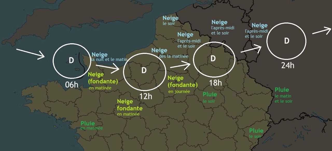 Nous commençons notre périple à l’ouest de la Normandie, dans le département de la Manche, où l’air polaire maritime commence à devenir assez froid pour produire de la neige. Là, la neige est tombée dès la nuit du 9 au 10 février.