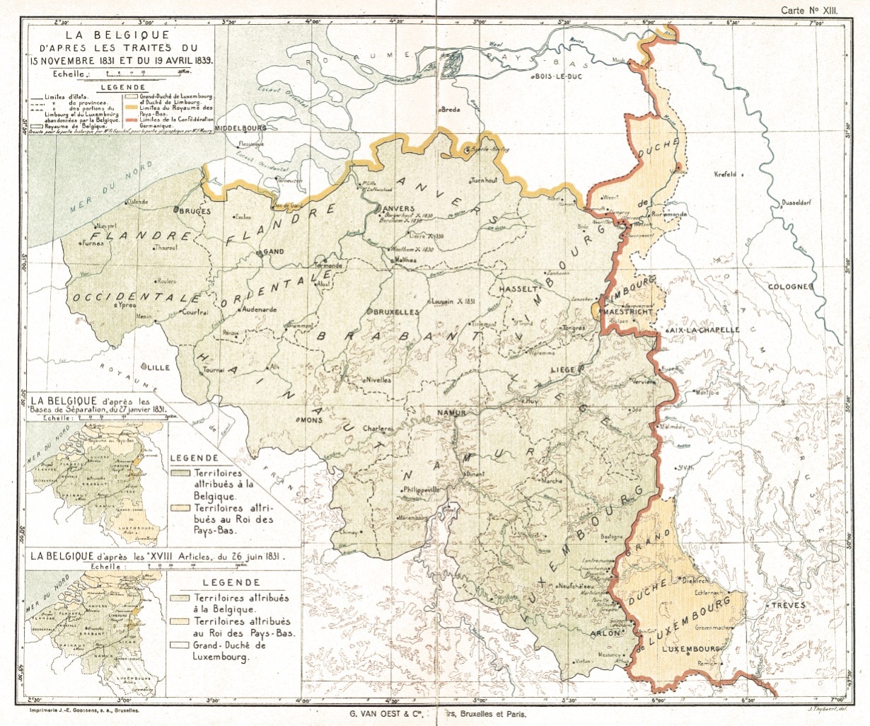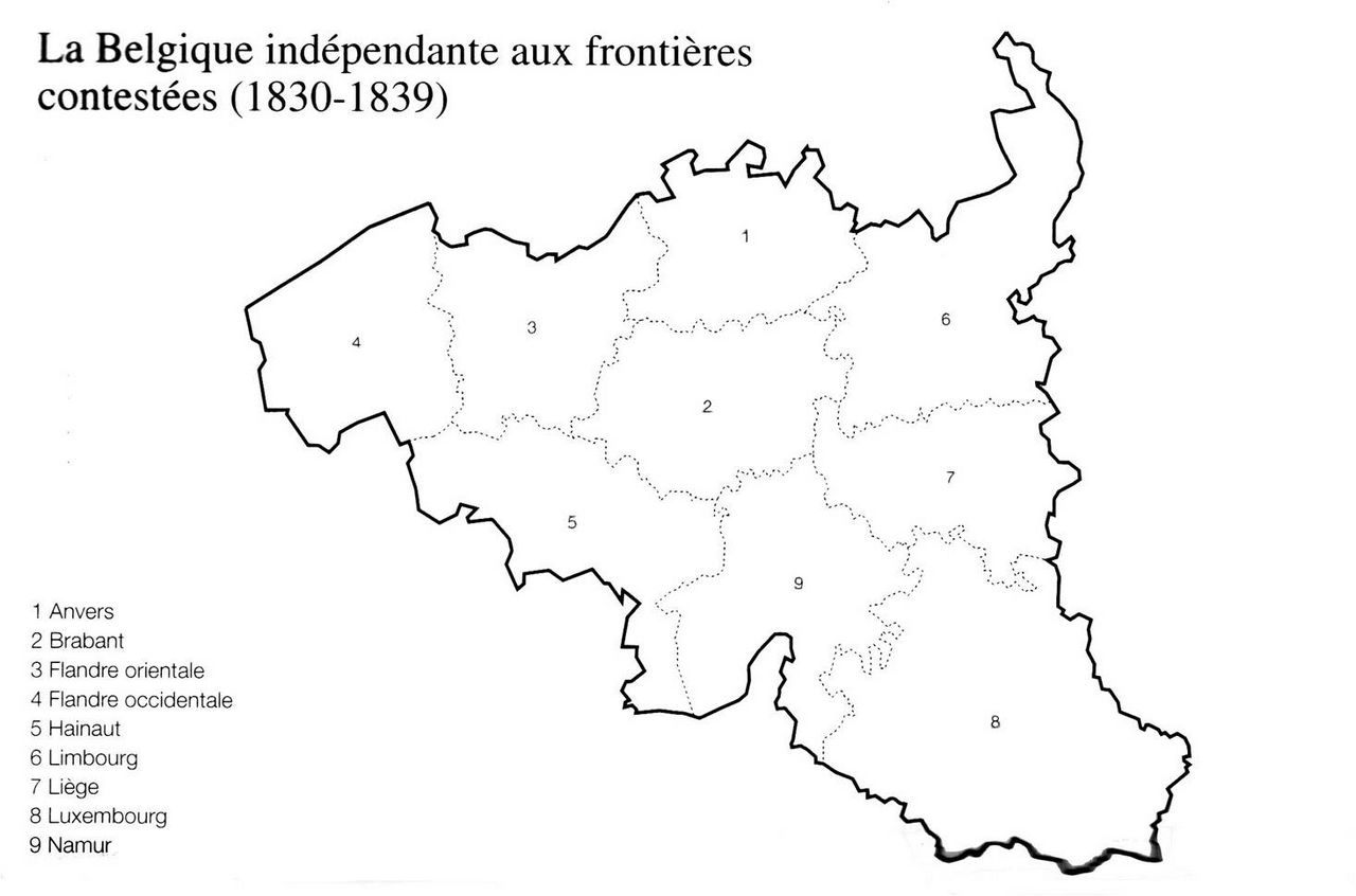 Comme dit sur l’intitulé de la carte, ces frontières étaient contestées et la Belgique n’en avait pas encore décousu avec les Hollandais. Le 2 août 1831 déjà, Guillaume 1er, Roi des Pays-Bas, tentait de reconquérir la Belgique et ce n’est que grâce une intervention française que notre pays fut sauvé. Mais il aura fallu attendre le 18 novembre 1833 pour la guerre belgo-néerlandaise cesse définitivement. Cinq ans et demi plus tard, les Pays-Bas reconnaissent enfin la Belgique, mais en échange de la cession de certains territoires. C’est ainsi qu’une partie du Limbourg et une partie du Grand-Duché du Luxembourg seront restituées aux Pays-Bas. La Belgique prendra à ce moment, grosso modo, sa forme actuelle.