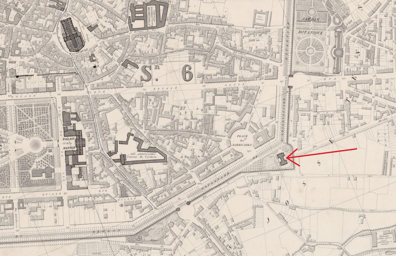 En 1837, ce coin nord-est du « pentagone » bruxellois était encore situé près de la campagne, parmi des nouveaux quartiers qui commençaient seulement à se développer. Le plan ci-dessous, antérieur de deux années seulement à 1837, montre bien la situation très en bordure de la ville de l’Observatoire de l’époque.