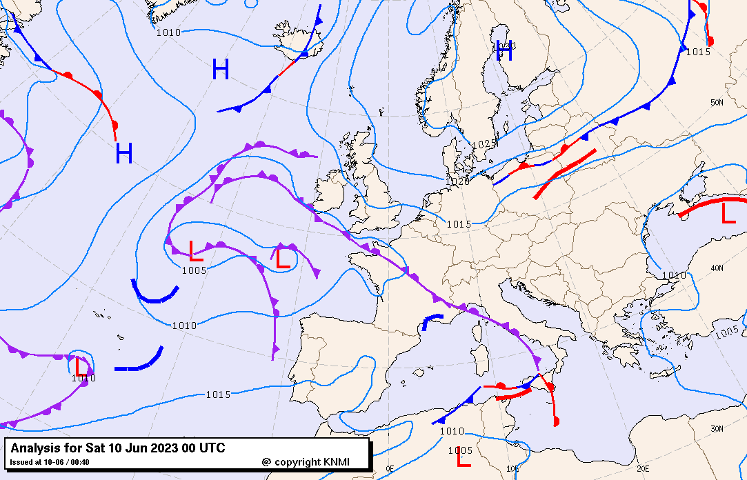 Ici, le 10 juin 2023, 1er jour de canicule de cette vague de chaleur. A noter le front orageux très statique sur la France : nous ne serons pas concernés par ces orages.
