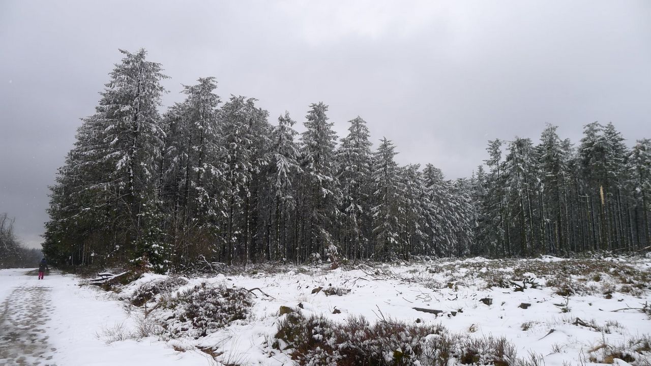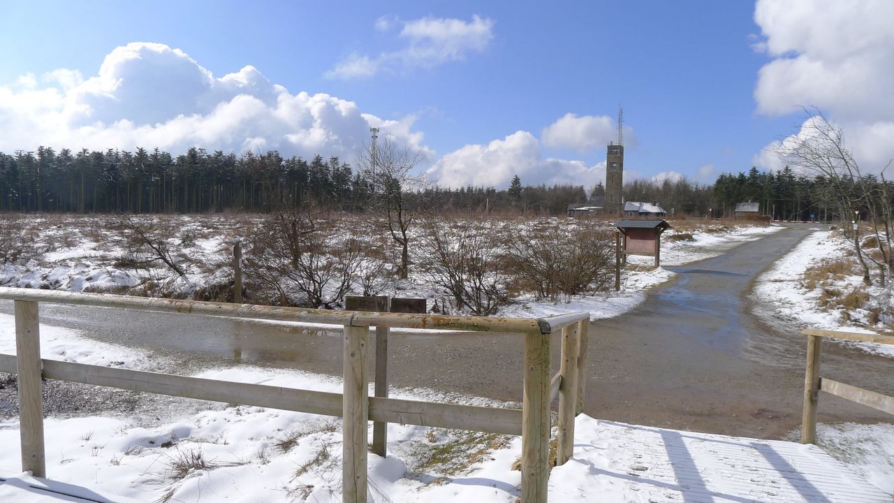 Retour de la neige en cette mi-mars 2021, la couche atteindra 10 cm par endroits dans les Hautes Fagnes, comme ici près du Signal de Botrange, le17 mars 2021.