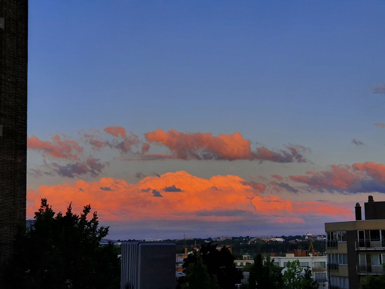 Le soleil couchant envoie de belles couleurs rouge-orangées sur les nuages cumuliformes, ce 27 juin 2022 à Neder-Over-Heembeek.