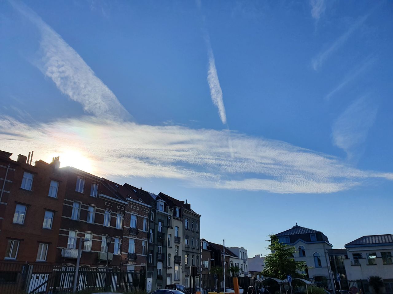 Banc de cirrocumulus dans le ciel de Koekelberg, le 29 juin 2022. Notez comme les couleurs sont irisées près du soleil, preuve de la présence de cristaux de glace dans ces nuages d'altitude.