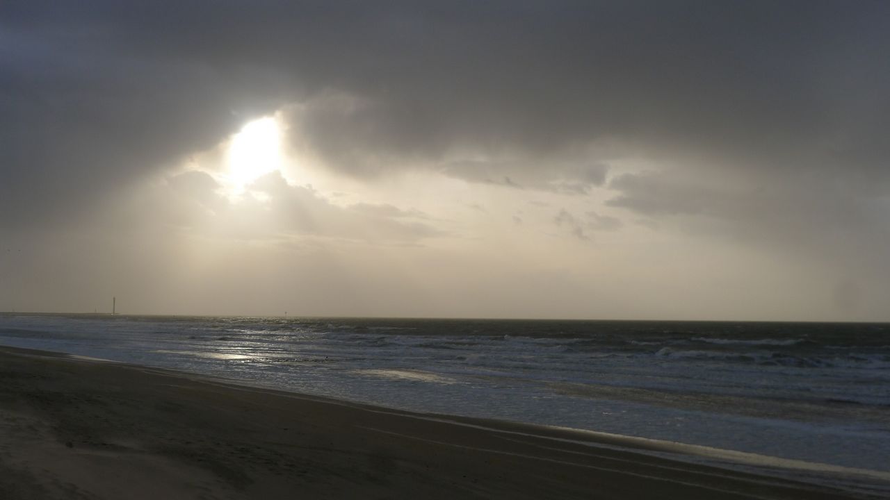 Jeux de lumière du soleil dans les nuages à la Côte belge, ici à Bredene, le 25 mars 2023.