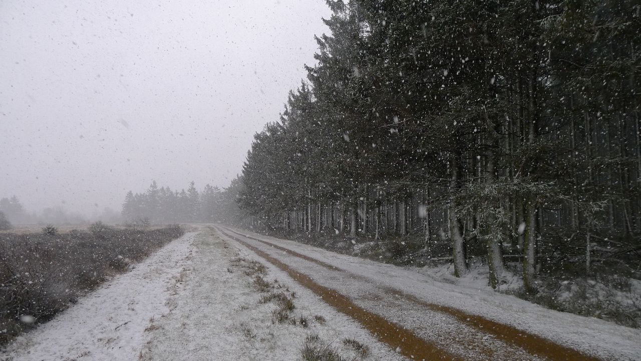 Retour des giboulées ce 27 mars 2023. Au moment des averses, une accumulation temporaire au sol de la neige sera même observée en Hautes Fagnes, comme ici à Botrange.
