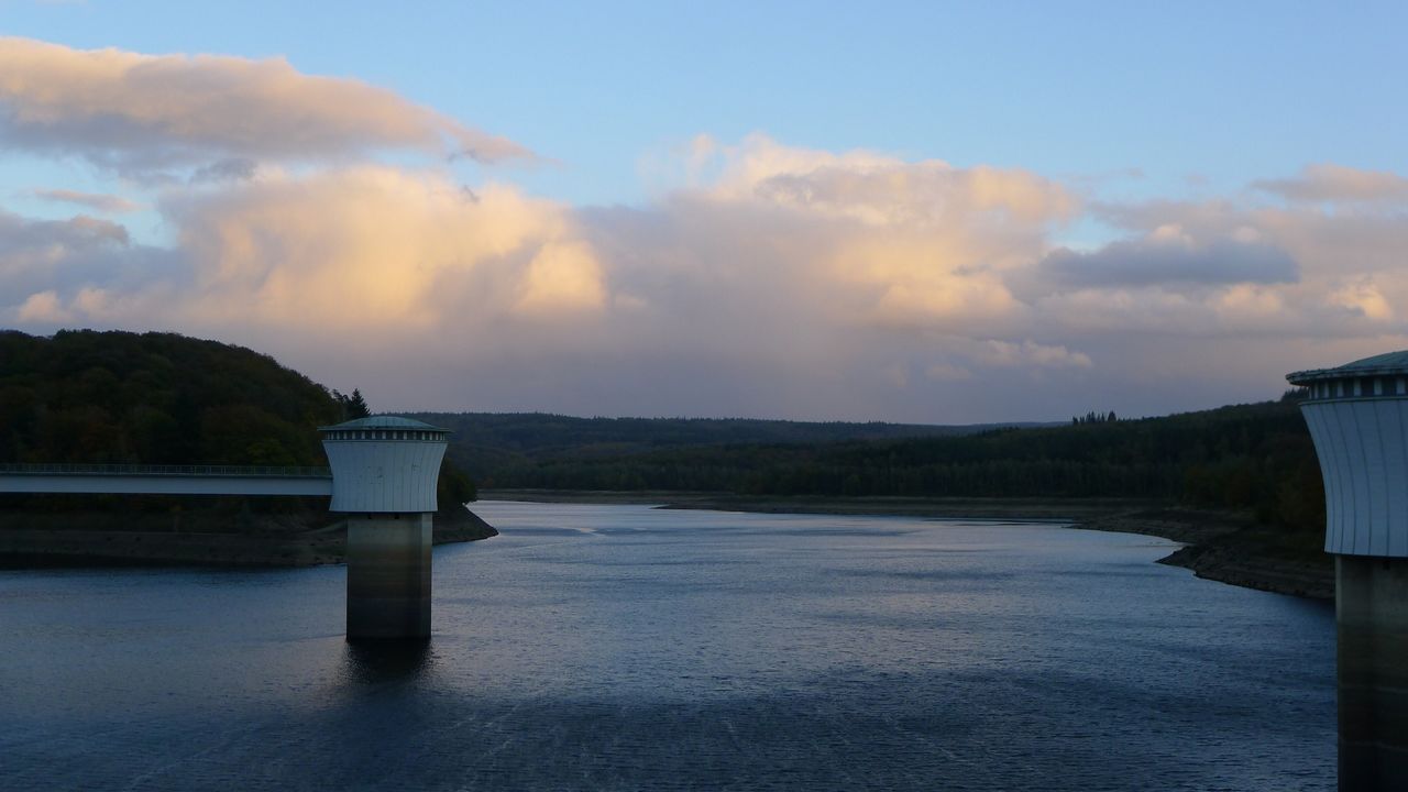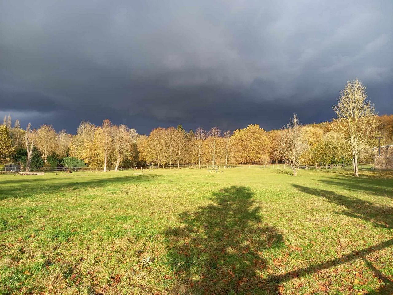 Cumulonimbus éclairés par le soleil couchant vu du barrage de la Gileppe, le 2 novembre 2023.