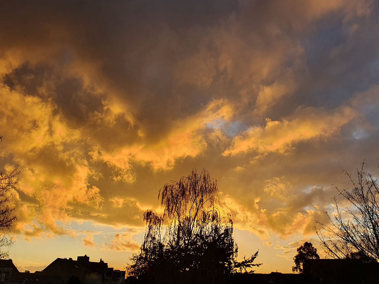 Le soleil couchant joue avec les nuages du crépuscule pour donner ce beau jeu de lumières que seule la nature peut nous offrir. Photo prise à Neder-Over-Heembeek (Bruxelles) , le 11 novembre 2023.