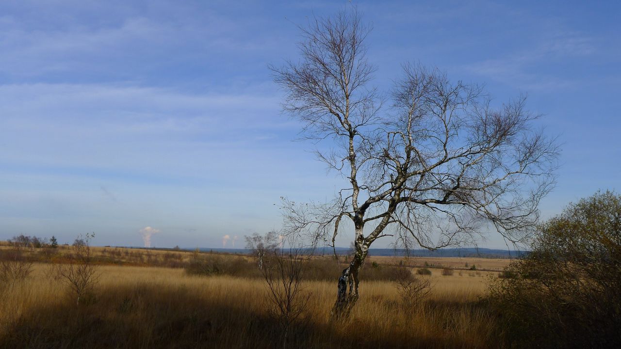 Une petite accalmie avec un peu de ciel bleu, bien rare durant ce mois de novembre 2023. Vue de la Baraque Michel (Jalhay), on voit dans le fond de l'image la condensation de vapeur d'eau qui émanent de tour de refroidissement des centrales thermiques allemandes, le 22 novembre 2023.