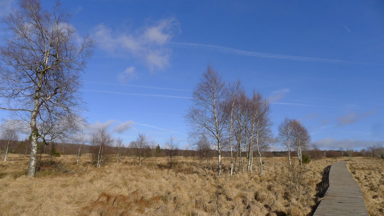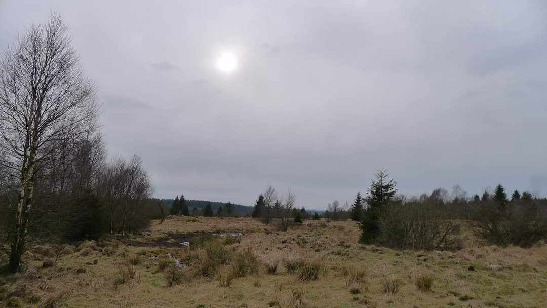 Les Hautes Fagnes sous un pâle soleil essayant vainement de percer les altostratus, ici à Mont-Rigi, le 21 février 2024.