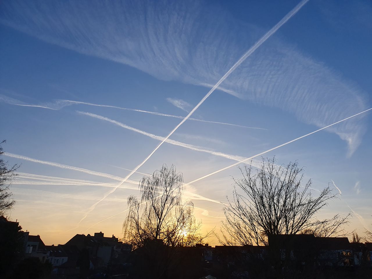 Vue du ciel au soir du 1er février 2024, le soleil couchant parmi les traînées de condensation à Neder-Over-Heembeek.